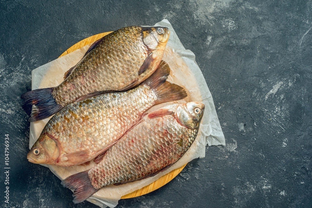 Three fresh carp on wooden board, top view, with copy space