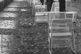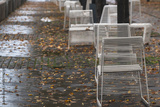 Metal chairs and tables stand on the autumn alley wet from the rain.