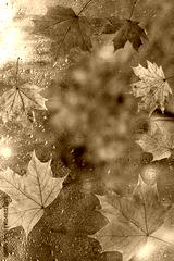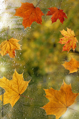 Seven maple leaves on a wet window with raindrops form an oval. autumn background frame