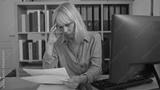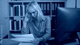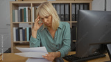 Woman working in an office while looking stressed, middle aged, blonde, reading papers at a desk in an indoor setting.