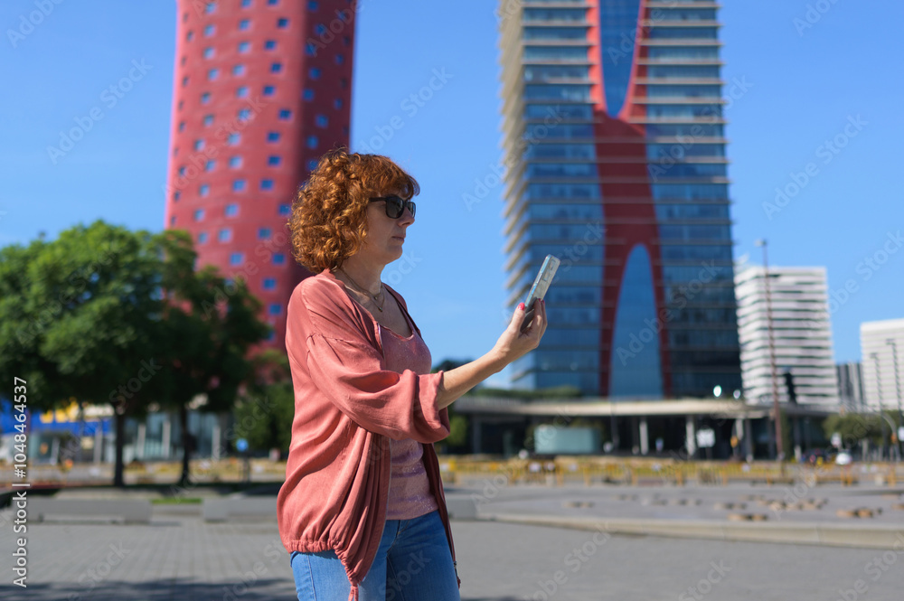 Redhead tourist taking pictures of modern architecture in barcelona using her smartphone