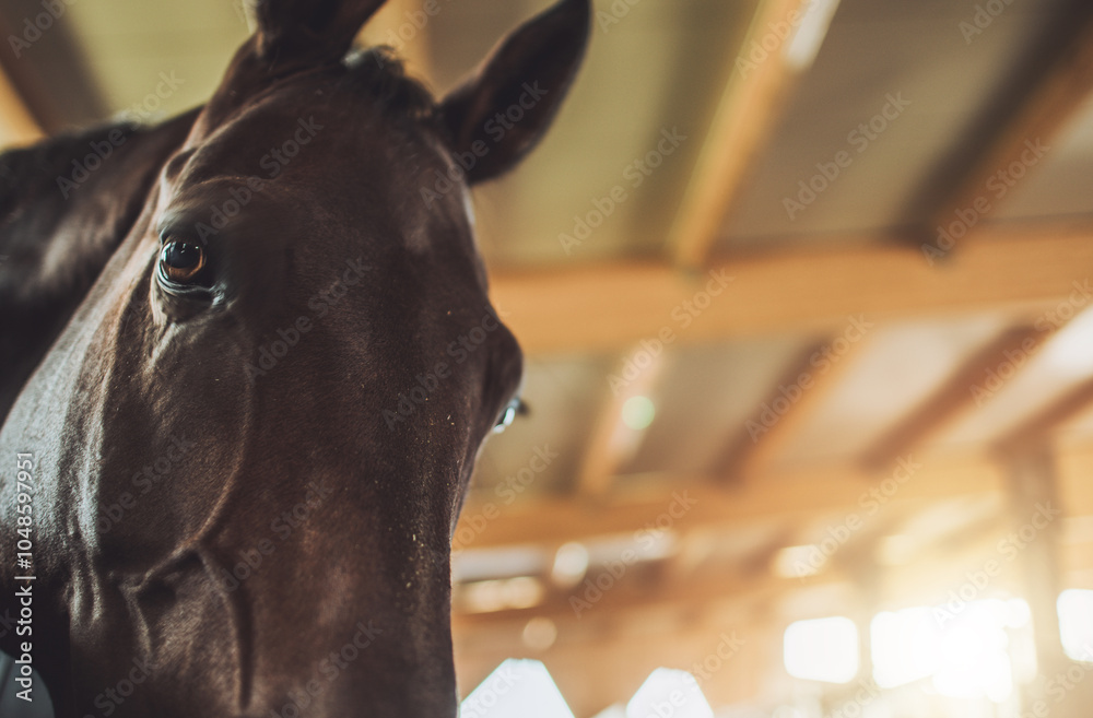 A Close-Up of a Brown Horse in a Stable With Warm Natural Light Illuminating the Background
