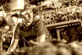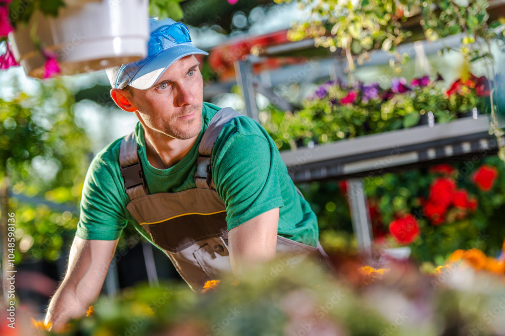 Male Gardener Tending to Vibrant Flowers in a Greenhouse During Daylight Hours