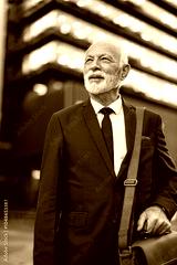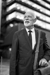 Thoughtful elderly male commuter with laptop bag looking away and standing outside office in city
