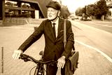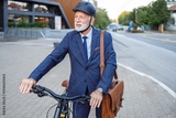 Senior businessman with helmet and bag pushing his bicycle while walking on city street after work