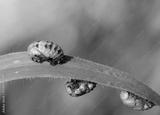 Ladybug pupa on the grass. Insect larva in hibernation or before becoming an insect. Small insect on the grass.