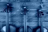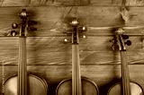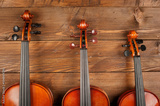 three violins in wood background