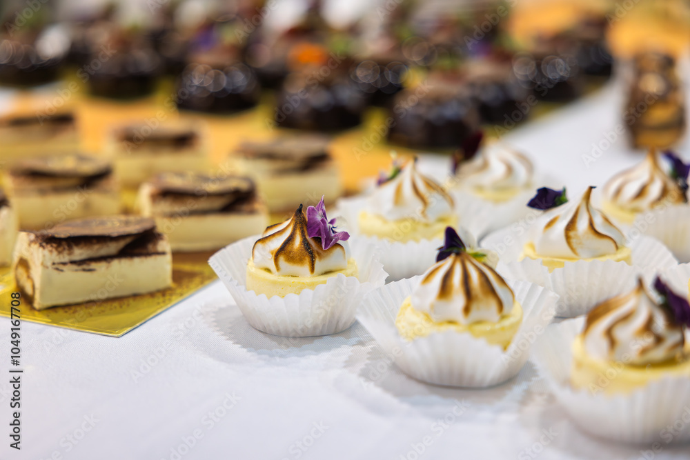 Cake mini with edible flowers, patisserie lemon tart meringue. Dark chocolate mousse cakes with strawberry and edible flowers. Soft, decadent, patisserie