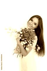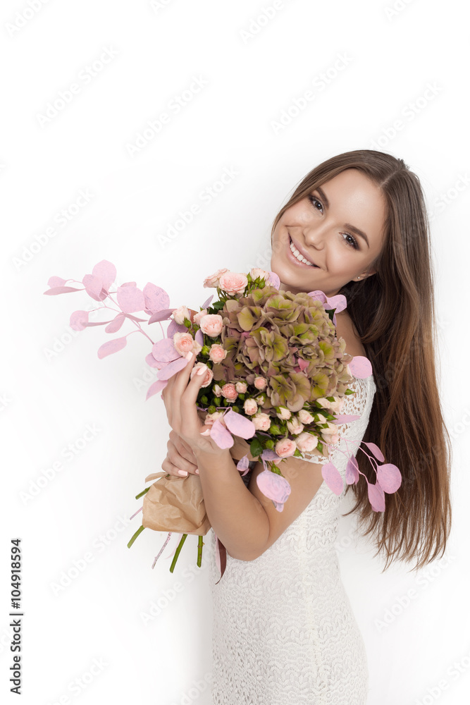 Young cute woman with spring flower bouquet