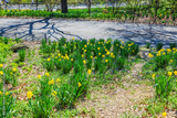 Blooming yellow daffodils on sunlit spring day, with tree shadows stretching across pathway in Central Park. New York. USA.