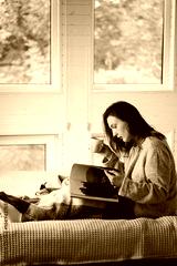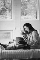 A woman relaxes in a bright, serene room, sipping coffee while focused on her book. The natural light from the windows enhances the cozy atmosphere.