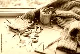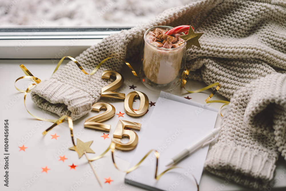 A warm setting featuring a list titled Goals 2025, a cozy knit sweater, festive candy canes, and decorative elements, perfect for New Year's planning.