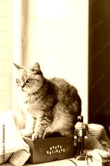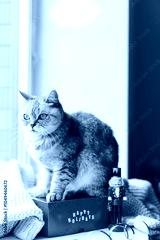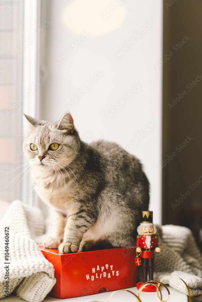 A cheerful cat sits on a bright red gift box labeled Happy Holidays, next to a nutcracker figurine, creating a heartwarming festive atmosphere indoors.