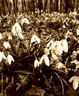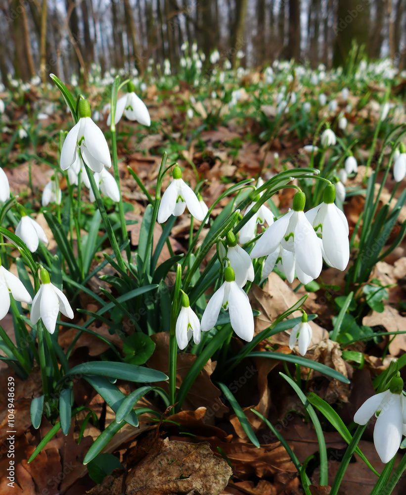 Spring snowdrop flowers Galanthus nivalis blooming in the forest near Dobrin, Czech Republic