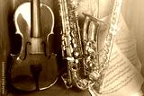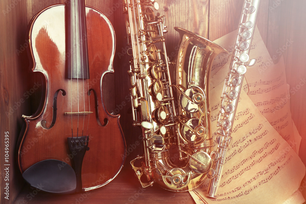 Musical instruments: saxophone, violin and flute with notes on wooden background