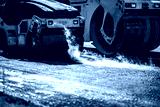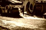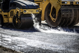 Steam rises from asphalt as heavy rollers compact a newly laid road in a construction zone during the day