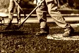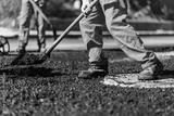 Workers apply hot asphalt for street repair during a sunny day in an urban environment, ensuring smooth road surfaces for vehicles