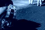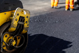 Workers operating a road roller during asphalt resurfacing on a sunny day in an urban area