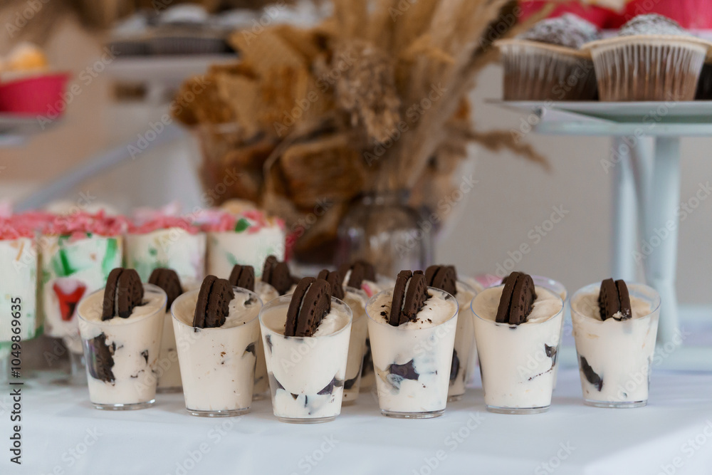 Delicious Dessert Display Featuring Mini Oreo Parfaits and Cupcakes