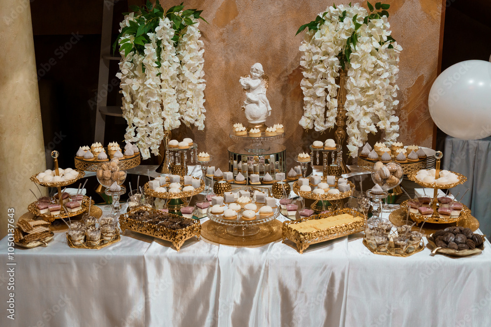Exquisite Dessert Table Display with Ornaments and Floral Accents