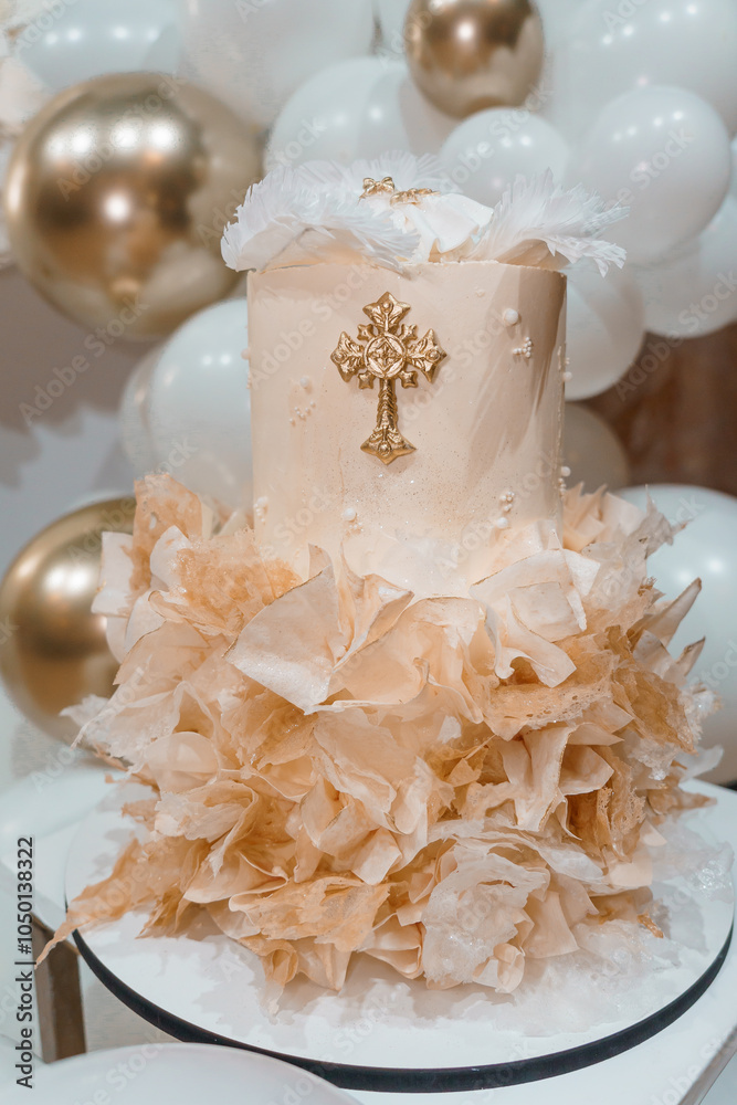 Elegant Christening Cake with Decorative Flourishes and Gold Accents