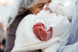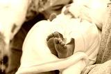 Tender Moments: A Close-Up of a Newborn's Tiny Feet in a Loving Embrace