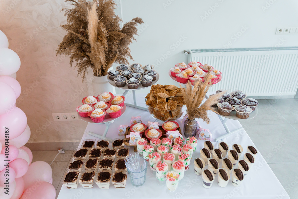 Delightful Dessert Table Featuring Colorful Cupcakes and Elegant Treats