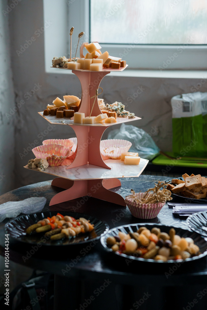Elegant Cheese Display on Three-Tier Stand with Assorted Accompaniments