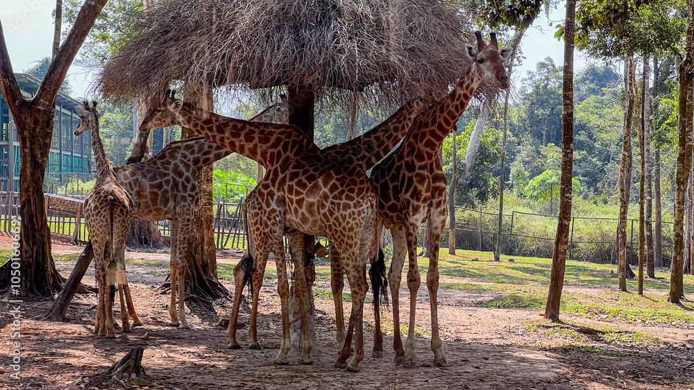 A group of giraffes congregates under a tree canopy in a wildlife park, symbolizing wildlife conservation and biodiversity