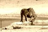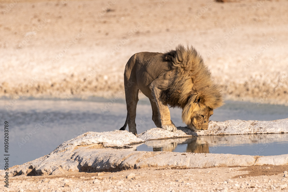 Close-up of a male lion -Panthera leo- drinking from a waterhole in Etosha national Park, Namibia.