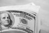 A pile of one hundred US dollar bills on a wooden table