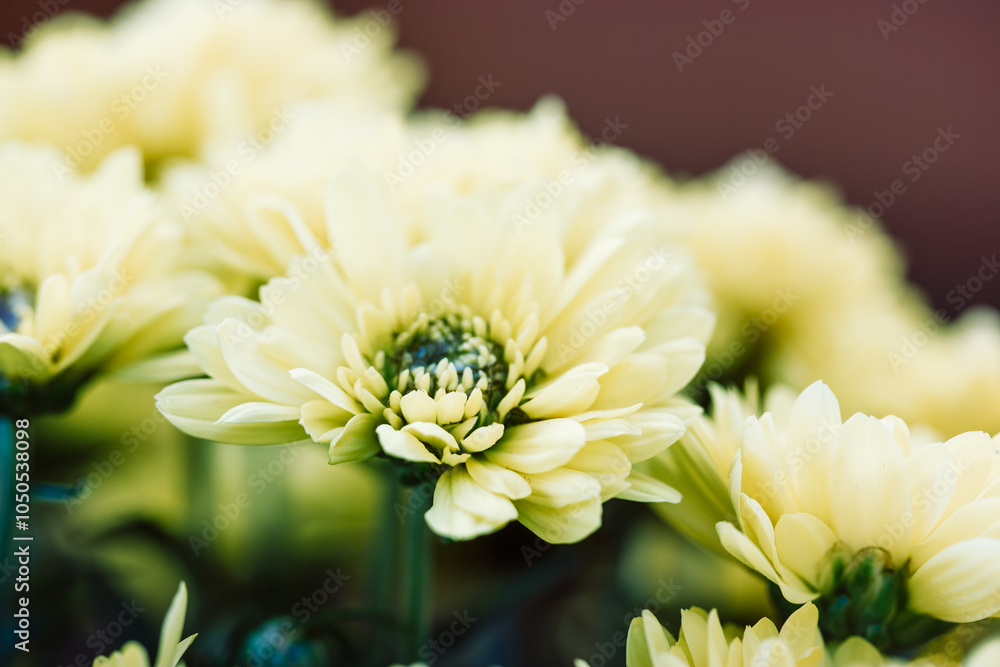 Gorgeous pale yellow green small chrysanthemums buds petals. Bulbous bloom.