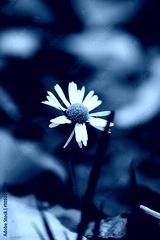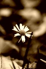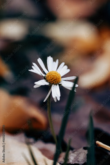White single chamomile flower growing in an autumn park. The flower is breaking through the fallen leaves on the ground. Vertical floral background.