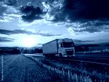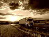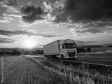 White truck driving on the asphalt road in rural landscape at a dramatic sunset