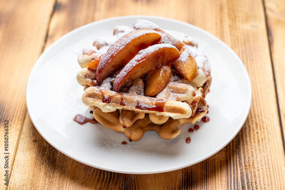 Belgian waffles with apples stewed in wine sauce sprinkled with powdered sugar on a white plate on a wooden background. Place for text