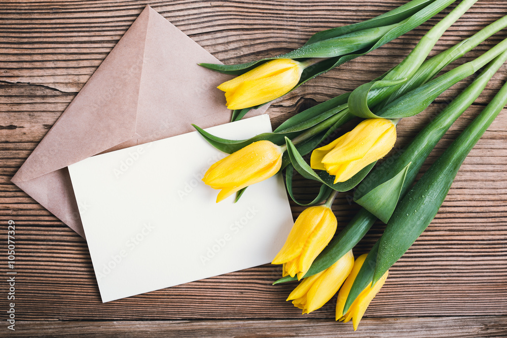 Yellow tulips and envelope on wooden table