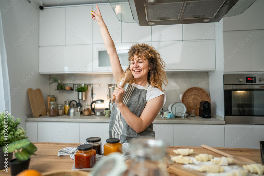 One happy young adult caucasian woman wear apron in the kitchen smile