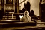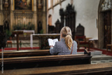 Christian woman is reading bible and praying in church. Religion and spirituality concept. Silent prayer to God