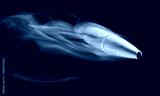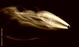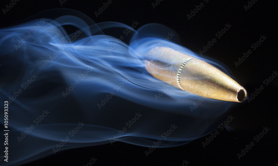 Near miss as a copper jacketed precision bullet streaks by on a black background with smoke trailing behind