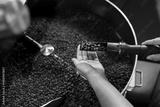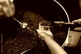 Handful of fried coffee grains. Roasted coffee beans in roasting machine in the production. High quality coffee beans manufacturing.