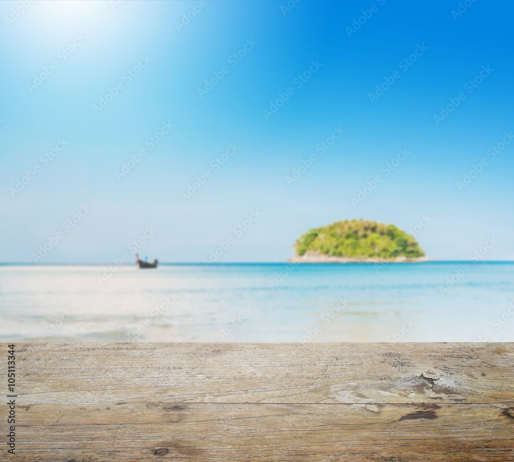 wooden table top with blur of beautiful seascape with blue sea beach island and the long tail boat under clear sky in summer,kata beach - phuket