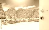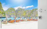 opened white door to blurred long tail boat on white sand beach at maya bay, phi phi leh island, thailand