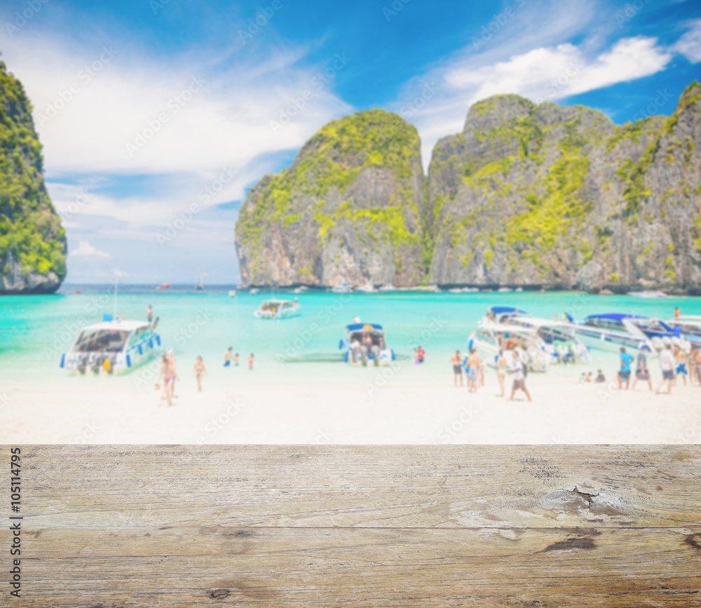 wood table top with blurred people at maya bay, phi phi leh island, thailand