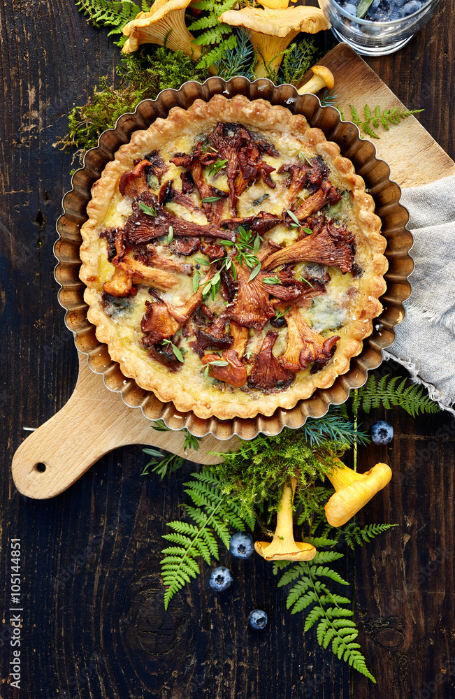 Quiche with chanterelle mushrooms and fresh savory on a wooden rustic table