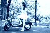 Portrait of happy young woman with smartphone on the red scooter