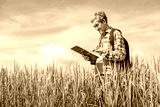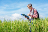 portrait agronomist or researcher writing paperwork on clipboard while examining rice plant in paddy field,rice research,rice agriculture development