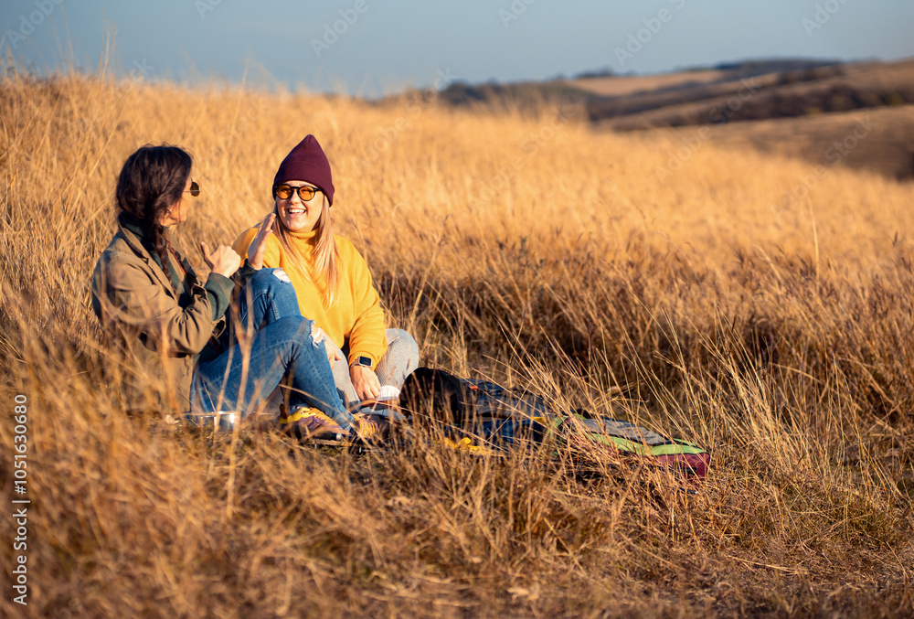 Two woman sitting at top of the hill at meadow resting after hiking.