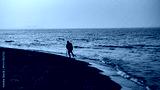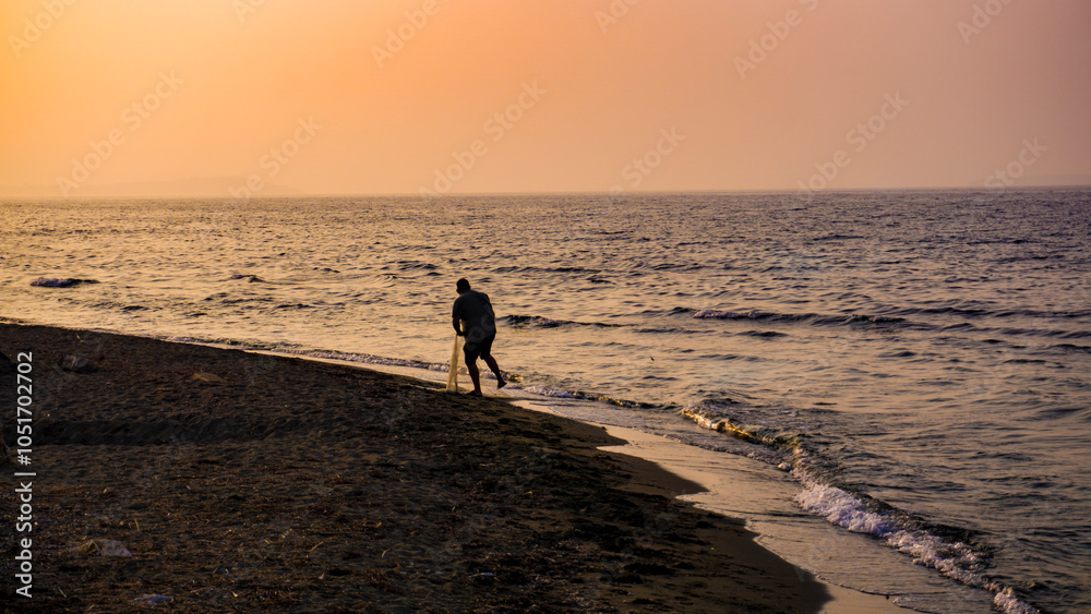 A man standing by the seashore during sunset, casting a fishing net into the water. The warm colors of the setting sun create a tranquil and serene atmosphere, reflecting off the gentle waves. Keyword