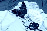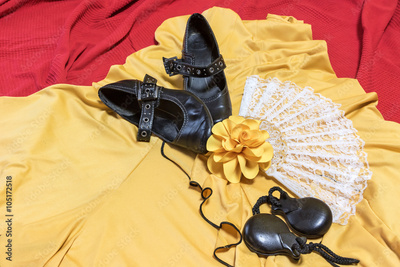Aerial view of assesories for Flamenco dance. Black shoes, yellow rose, white fan and castanets are lying on a yellow clothes and red underlay.
