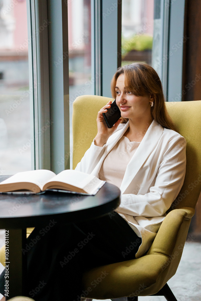 Professional Woman in Modern Office Setting Engaged in Phone Conversation